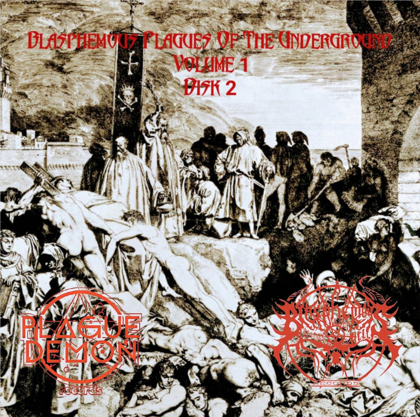 2 disks, jewel case CDs with 26 bands from PLAGUE DEMON RECORDS and BLASPHEMOUS CREATIONS OF HELL RECORDS